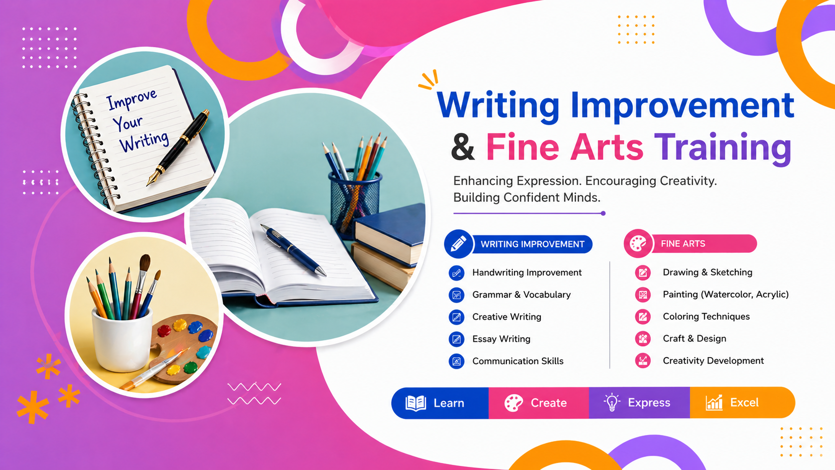 Giving wings to the artists who’d like to take it up as a career or just a hobby. Our students are trained by professionals who help them develop, learn and polish their skills while at school. and creativity.